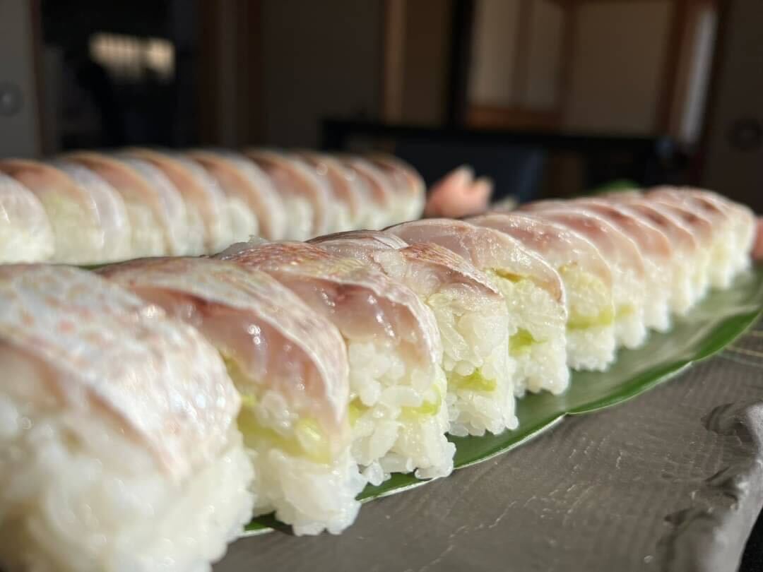 花鯛と銚子名産灯台キャベツとのコラボ。白い酢飯に淡い緑のキャベツを挟み、薄い紅を帯びた花鯛をのせた花鯛寿司です。
